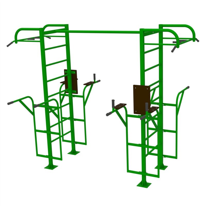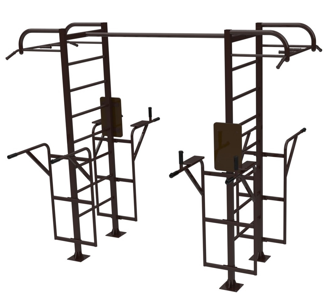 Две пары брусьев: стандартные с рукоятками и специализированные для тренировки пресса.